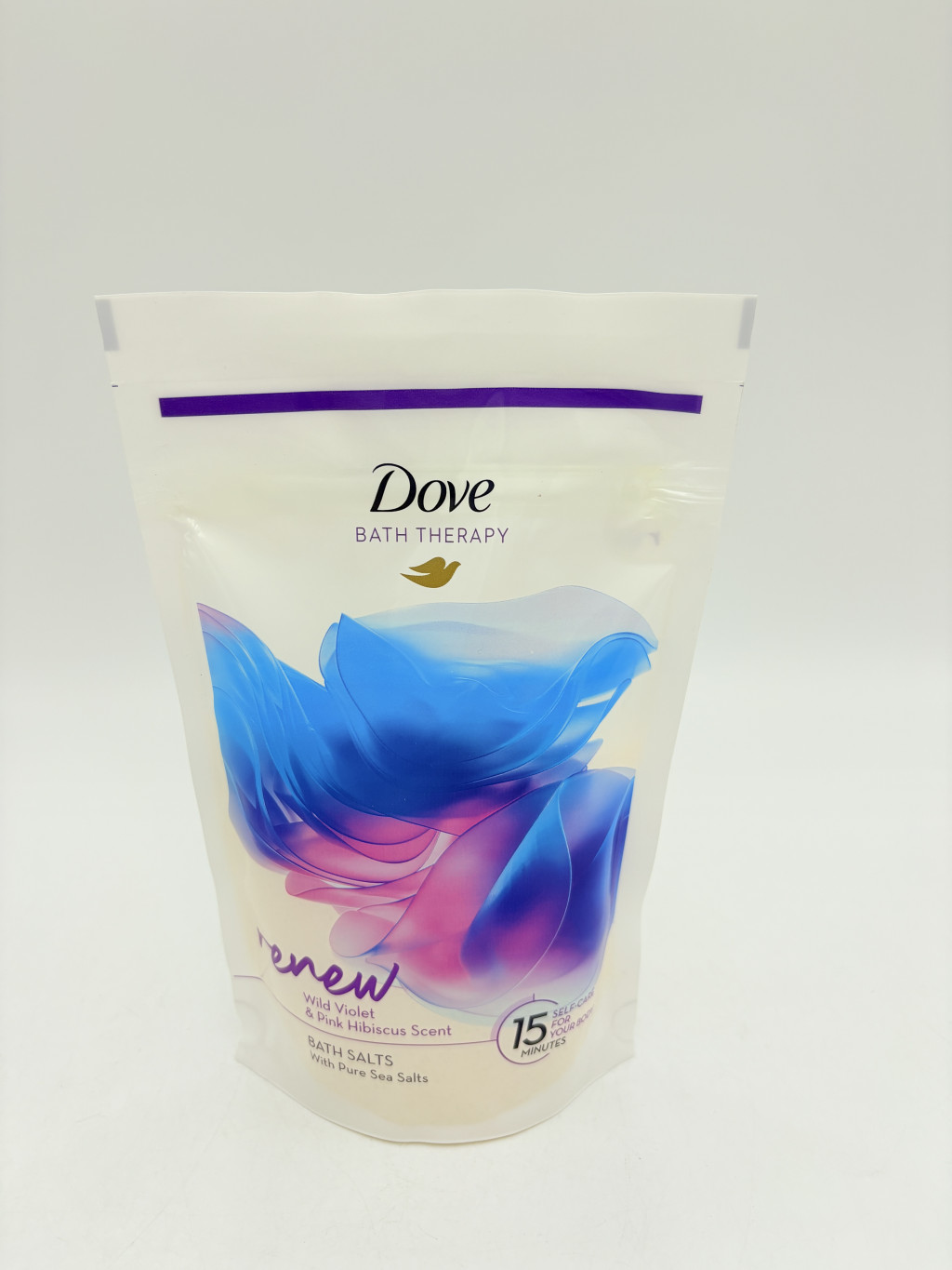 - Szórj a vízbe a Dove Bath Therapy Renew Wild Violet & Pink Hibiscus fürdősóból a kívánt mennyiségben.